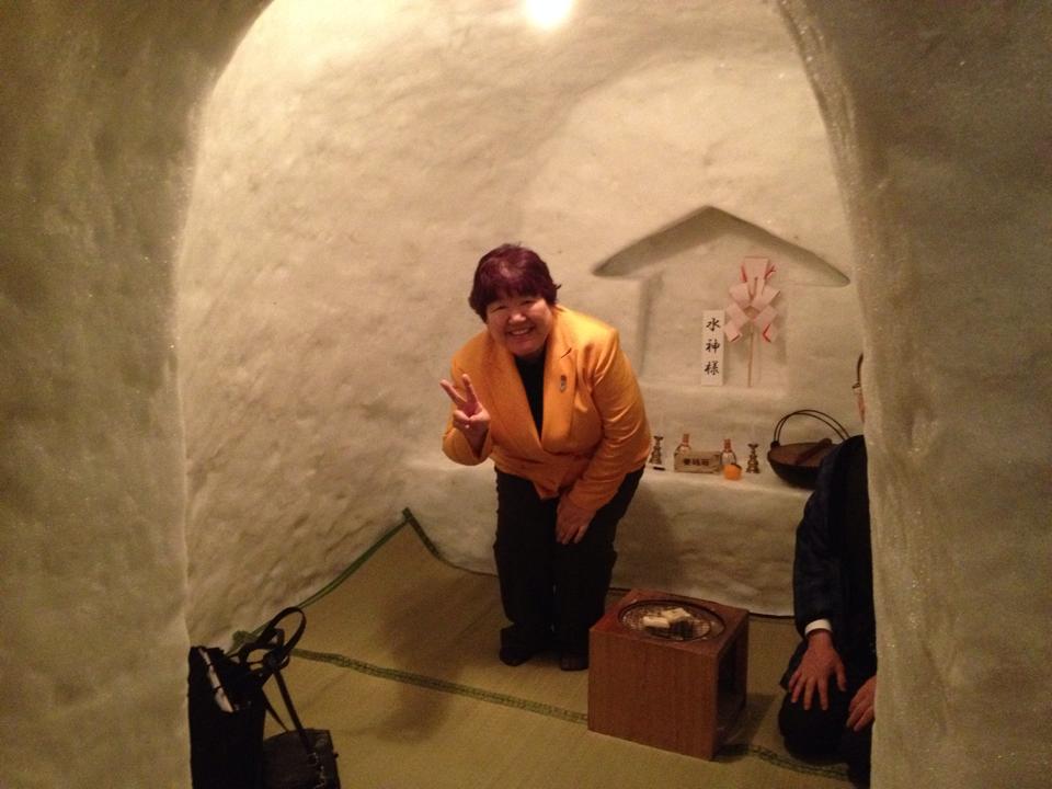 横手市の「かまくら」に入ってみました。もちろん、本物の雪です。内部は1年中マイナス10度だそうです。毎年1月には作り変えるそうですよ。壊す時はチェンソーで切り崩すそうです。