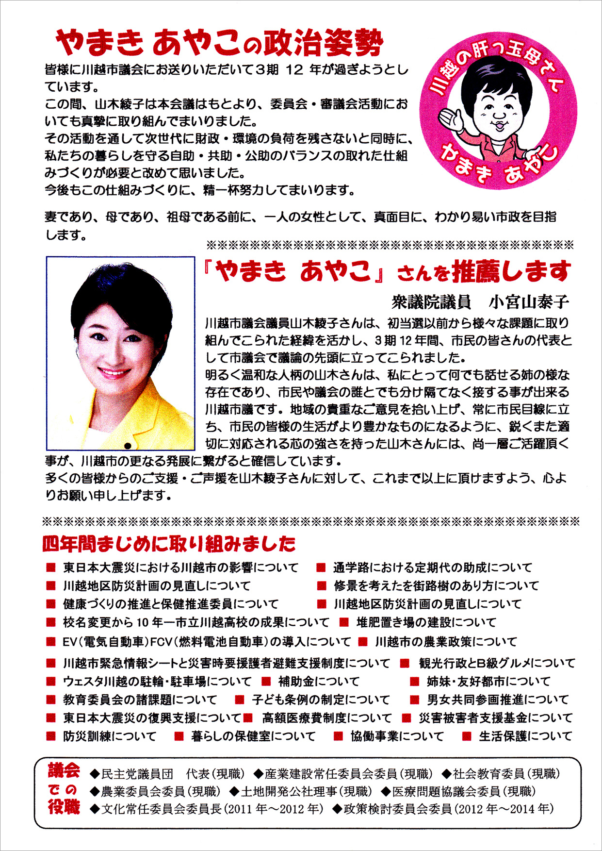 やまきあやこ – 川越市議会議員 は「忘れない」・「染まらない」・「流されない」を信条に、皆様にお約束したことの実現に市議会で、精一杯発言しています。