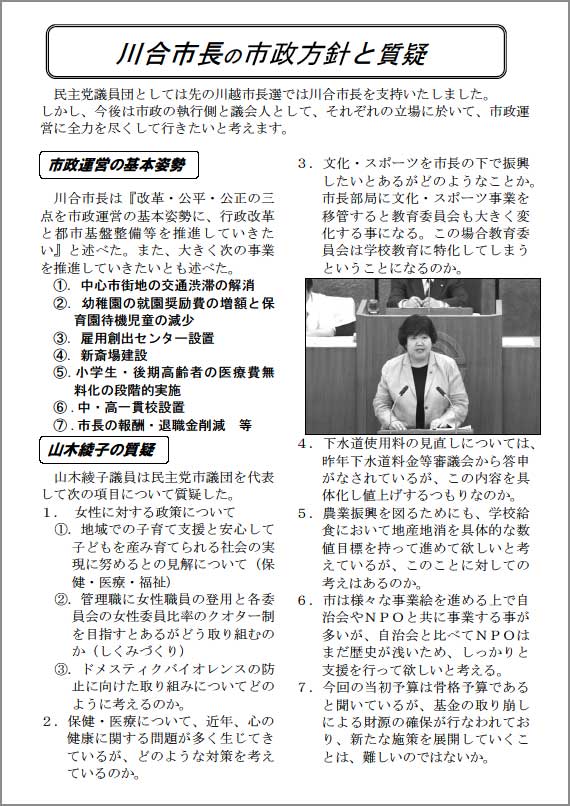 やまきあやこ – 川越市議会議員 は「忘れない」・「染まらない」・「流されない」を信条に、皆様にお約束したことの実現に市議会で、精一杯発言しています。