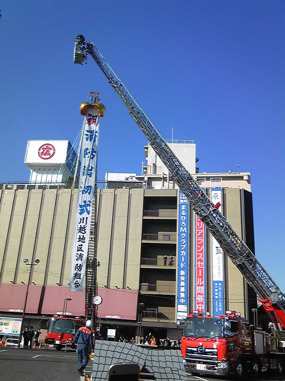 1月10日(日) 川越市の消防出初式に参加しました。 日頃訓練を続けている消防部隊訓練・木遣りとはしご乗り・消防車両分列行進・一斉放水と続いた。 なかでも圧巻だった、埼玉県防災航空隊による、ビルの屋上からの救出訓練には、多くの市民の皆様が拍手を贈った。 同乗の消防士は、日頃から、県の防災航空隊に派遣されて何時職員と説明がなされた。