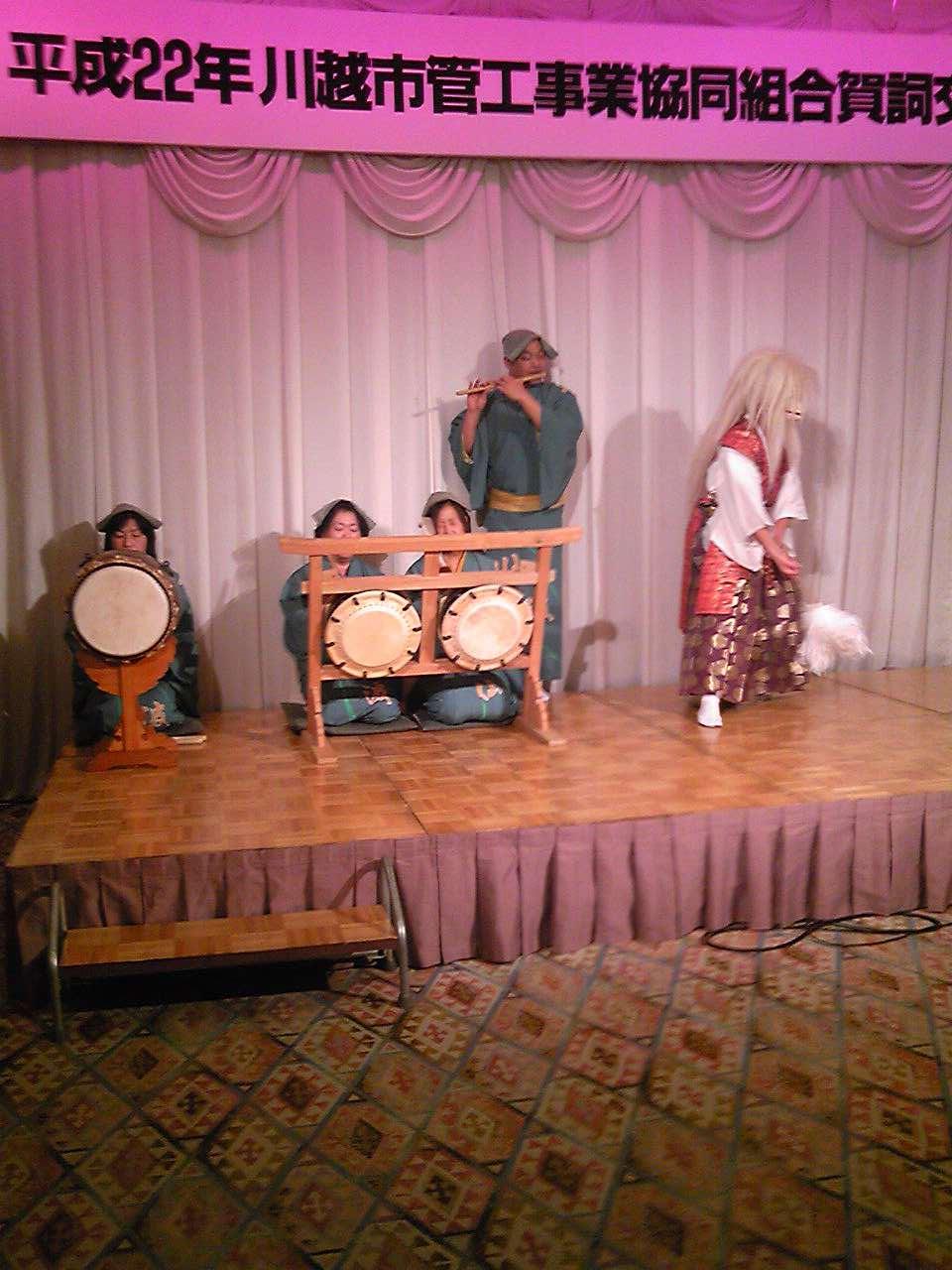 1月14日(木) 川越市管工事業協同組合の新年会に参加しました。 新年会と言うことでお囃子の披露が行なわれました。 太鼓や獅子舞に女性が参加していました。 私がこどもの頃は、お囃子はもちろんの事まつりの御輿は女性は担ぐことができませんでした。 子供心に、『どうして女の子はお御輿を担ぐことができないんだろう』と、思ったものです。 時代の移り変わりを感じたとともに、こどもの頃は、正月になると各家庭を回って来た獅子舞も今はすっかり姿を消してしまったことを、少し寂しく思いました。